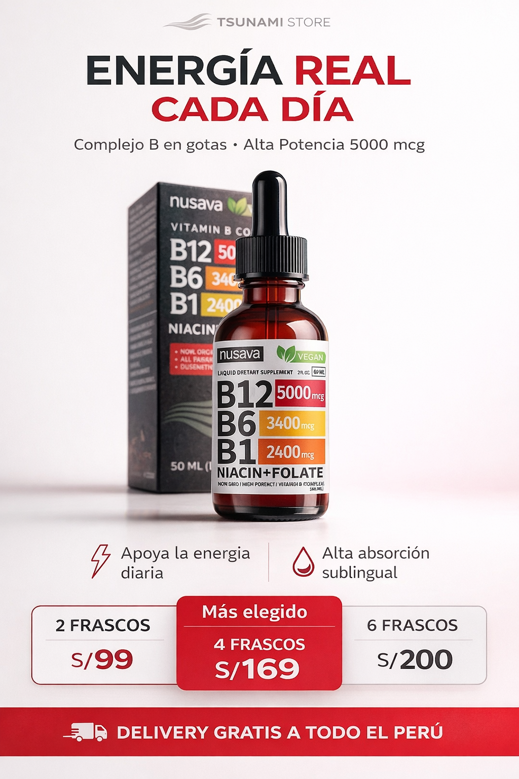 Vitamina B12 5000 mcg en Gotas Nusava – Complejo B Líquido Alta Potencia (2 Frascos)