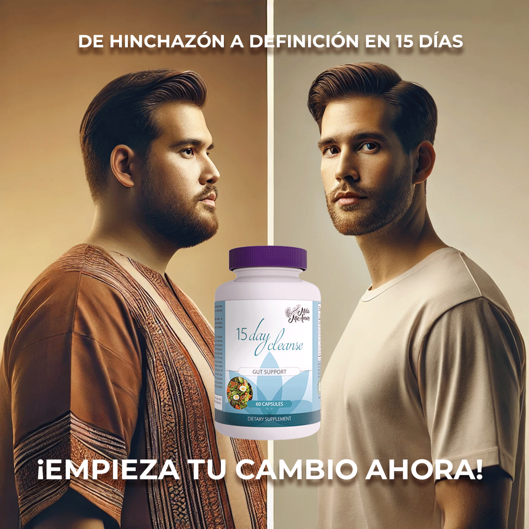 ¿Sientes hinchazón, cansancio o estreñimiento? Tu cuerpo puede estar acumulando toxinas que afectan tu digestión, energía y peso. El 15 Day Cleanse es un suplemento natural a base de extractos vegetales que ayuda a desintoxicar, mejorar la digestión y favorecer la pérdida de peso de manera segura y efectiva.