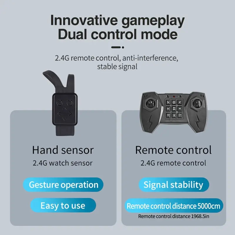 - 2 en 1: manejo con control remoto o con pulsera de gestos.