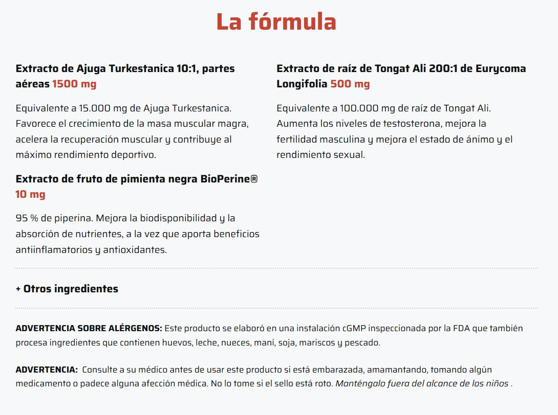 Esta potente combinación une Turkesterona, un ecdisteroide vegetal reconocido por acelerar el crecimiento muscular y mejorar la recuperación, con Tongkat Ali, uno de los extractos más estudiados para incrementar fuerza, vitalidad y rendimiento deportivo.